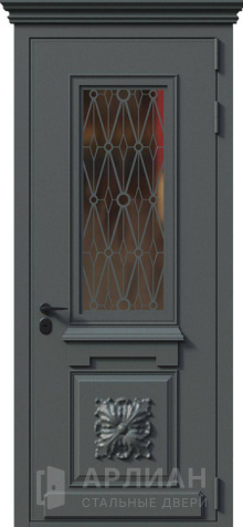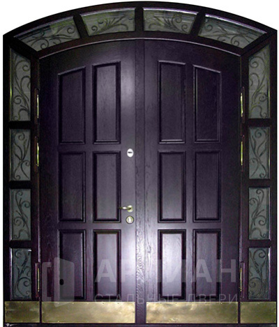 Входная арочная дверь с витражом и решеткой №419