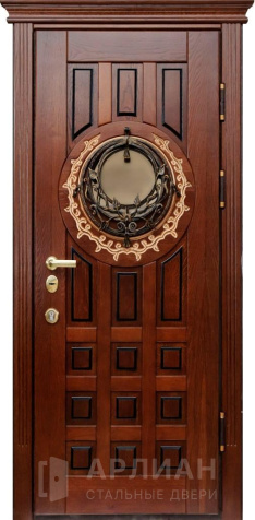 Входная коричневая дверь в частный дом со стеклопакетом и ковкой №11