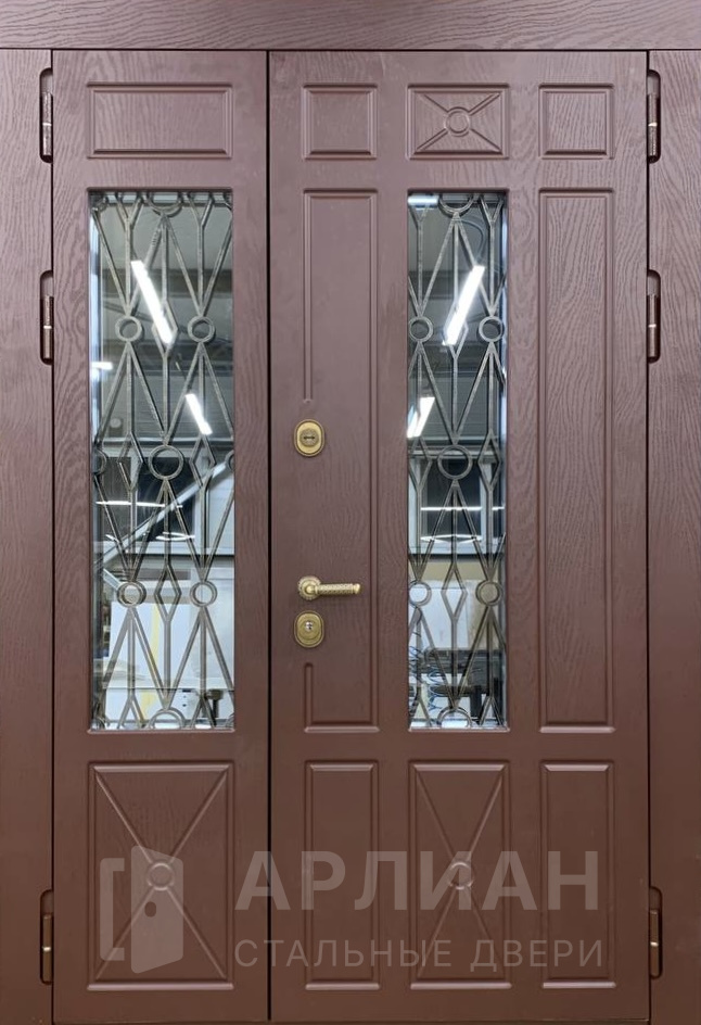 Фото «Входная двустворчатая дверь со стеклом и ковкой в загородный дом №14»